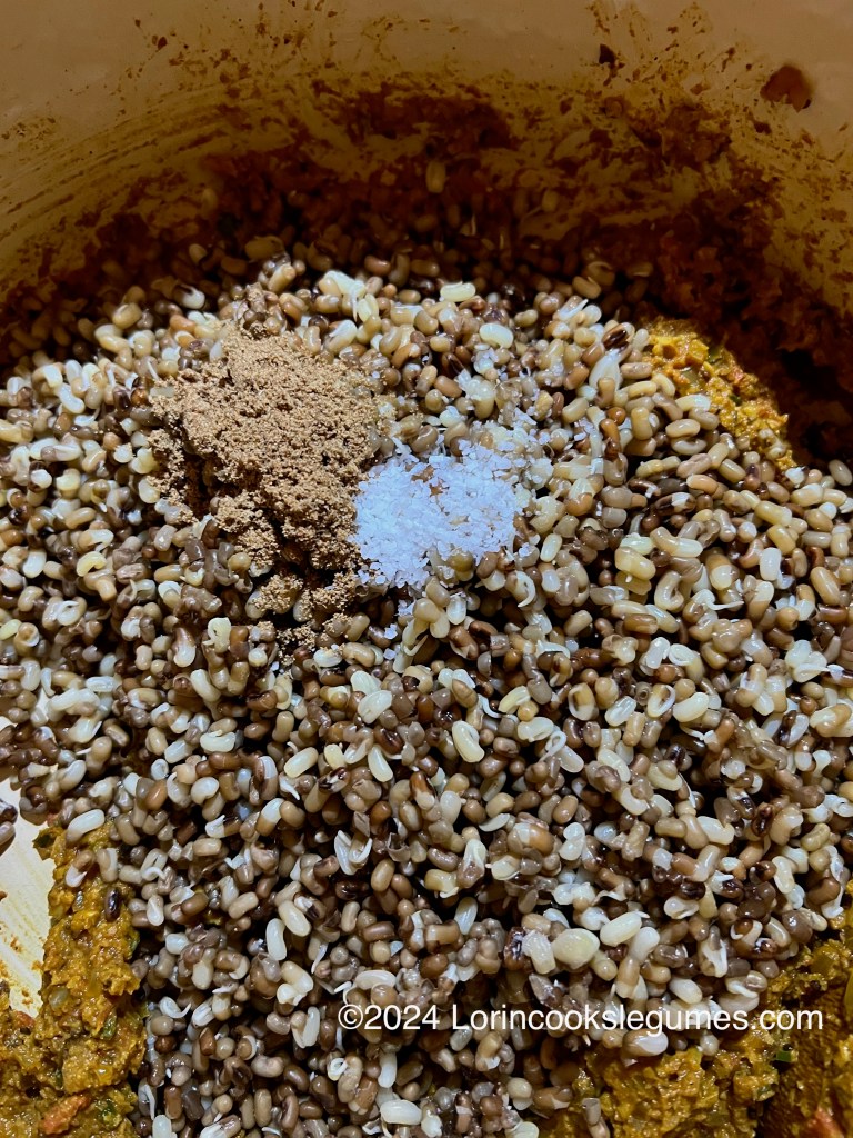 I chose to cook the sprouts in a regular pot instead of the pressure cooker this time, in order to avoid over cooking them. I simmered them for about 20 minutes, and probably could have gone a little longer as the beans still had a bit of crunch to them, but they’re still soft enough to eat. A number of the recipes I looked at just sautéed the sprouts with the spices and then added water and simmered everything together until the sprouts were cooked, so pre-cooking them isn’t strictly necessary, but I stuck with that method.