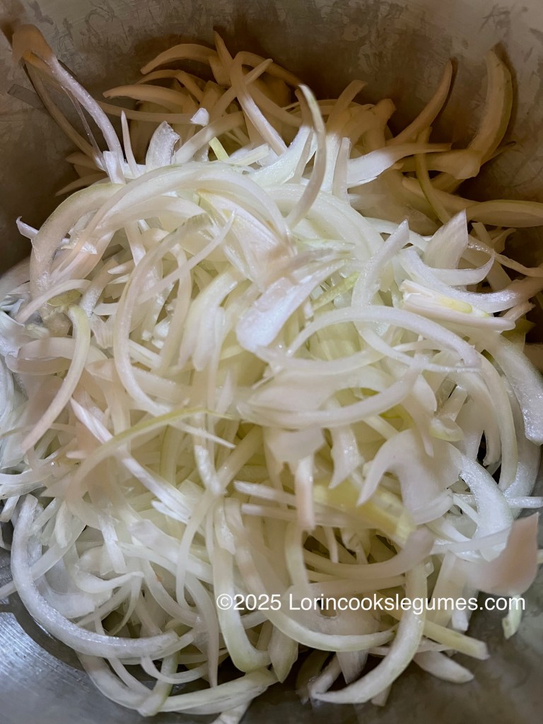 Peel your onions and cut in half, root to stem. Slice the onion into thin half-moons. Place onion in a large bowl and use your hands to separate the slices into individual slivers.