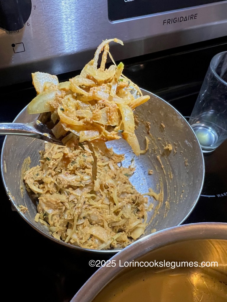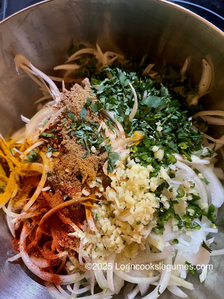 Add all the powdered spices, chili flakes, salt, ¼ cup cilantro, green chili, and ginger. Mix well, squeezing to extract juice from the onions, for several minutes, until the onion is limp and wet-looking.