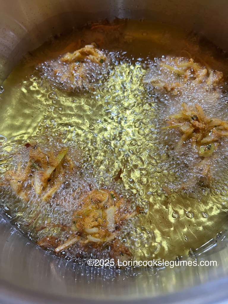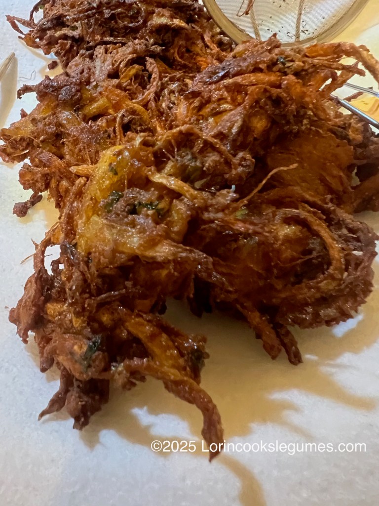 Most of the recipes I looked at used water in the batter, but a couple just called for squeezing the onions with some salt to extract their natural juices. I followed the latter method with great success and didn’t need any additional water. I’m sure that there is a texture difference between the two methods, but I haven’t experimented to see what it is. I did leave a little water in the recipe, as needed, if you want to try that method, prefer not to make your hands smell like onion, or find that there isn’t enough water from the onions.