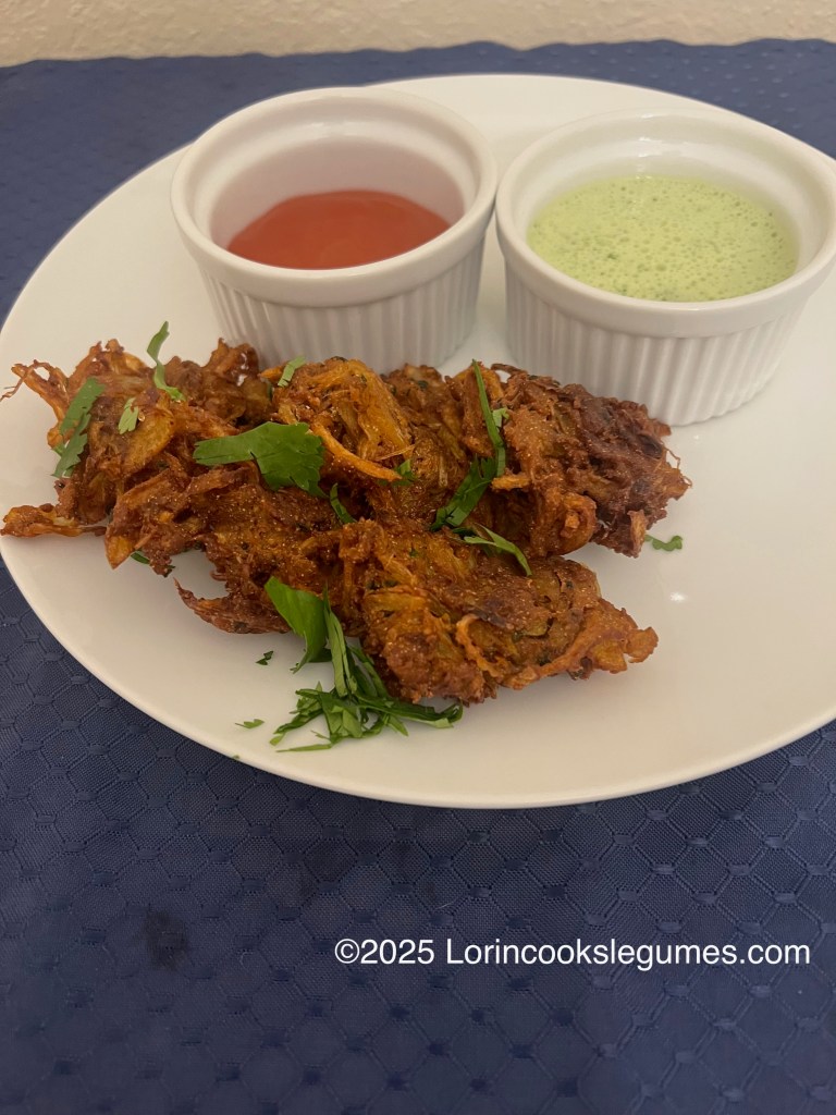 Adding cornstarch to the batter helps make a crispier bhaji, that even retains a little bit of crispness in the refrigerator! If you have leftovers you can reheat them in a 400F oven for about 5-6 minutes.