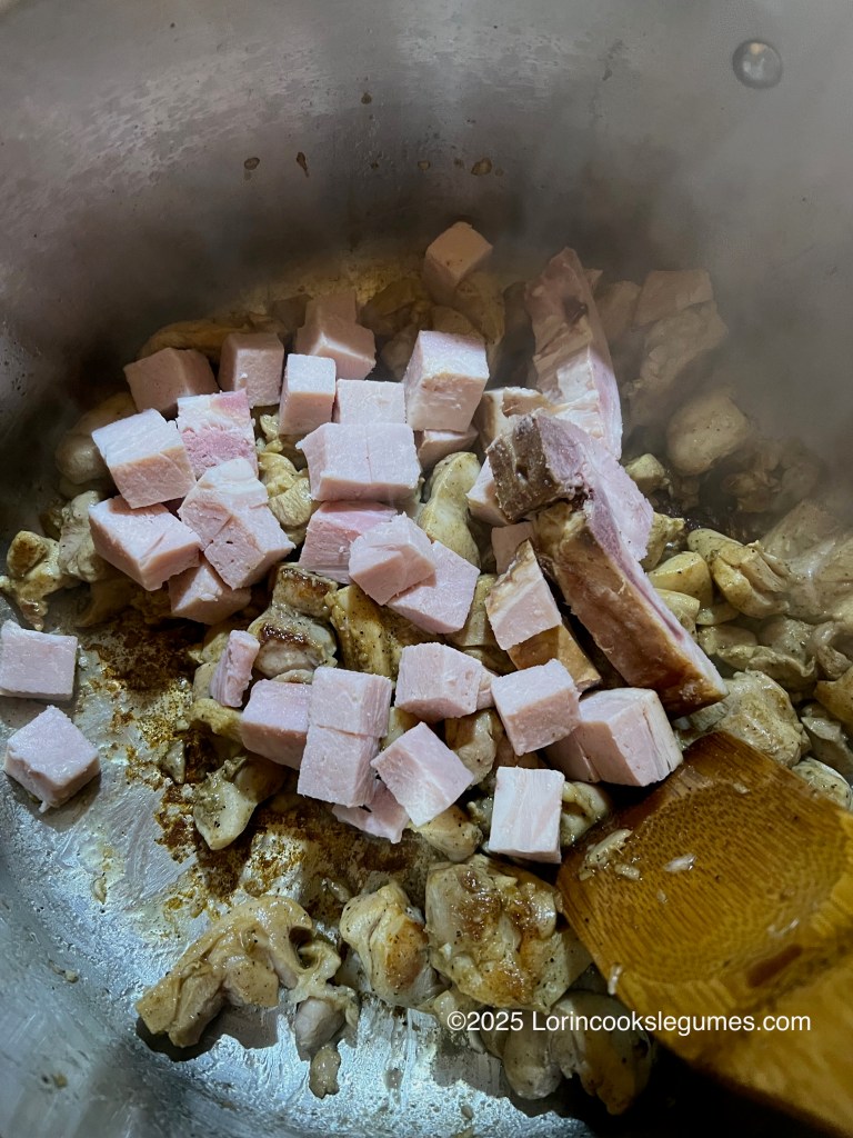 Heat oil in a large pot. Add the chicken and brown on all sides. Add the diced pork chop and bone and brown for a few minutes.