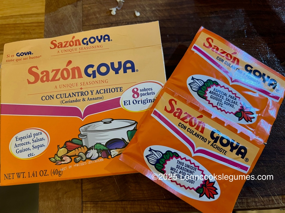 Sazon is a popular spice blend in various Caribbean cuisines. Its primary flavors are coriander and annatto, which gives dishes using it a nice red color (careful, it will stain your skin and any clothing it gets on). It often comes in little packets and has several flavor variations. If you are lucky enough to find it outside of a community with a sizable Puerto Rican or Caribbean population, it will probably be the Goya brand, which is mostly MSG. There are several other brands listed on Amazon, but this version* from Goya is the one I already had in my pantry. In the future, I will probably try one of the other brands.