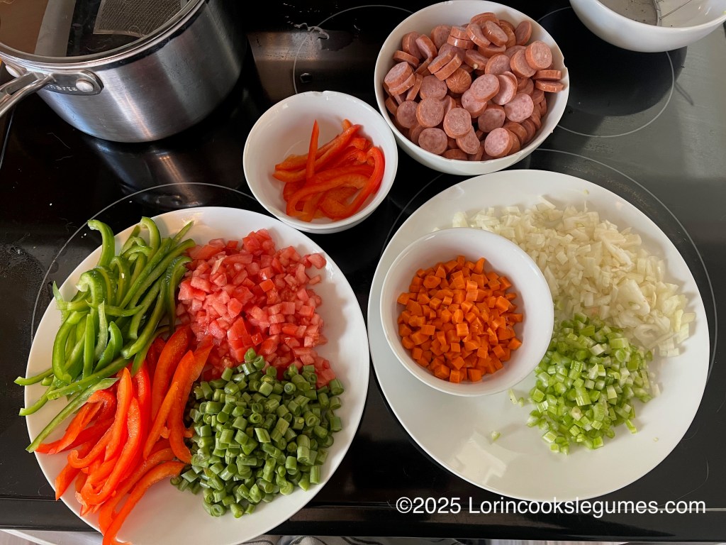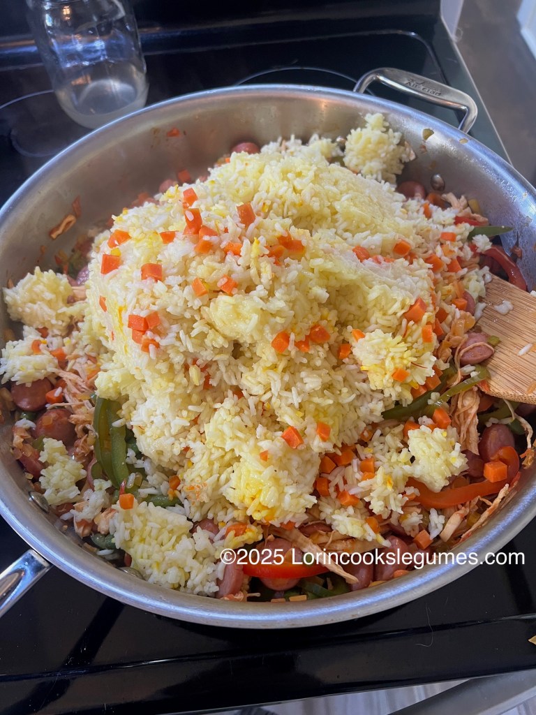 Move the vegetables to the side and add the hot dogs. Cook for a few minutes until the hot dogs begin to brown, then add the shredded chicken. Cook for a few minutes until everything is warm, adding a splash of chicken broth or water if it seems too dry (you want a little bit of juice to help carry the flavors to the rice, but it shouldn’t be at all soupy).