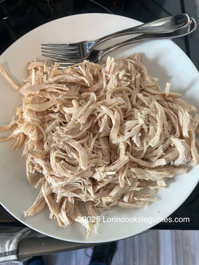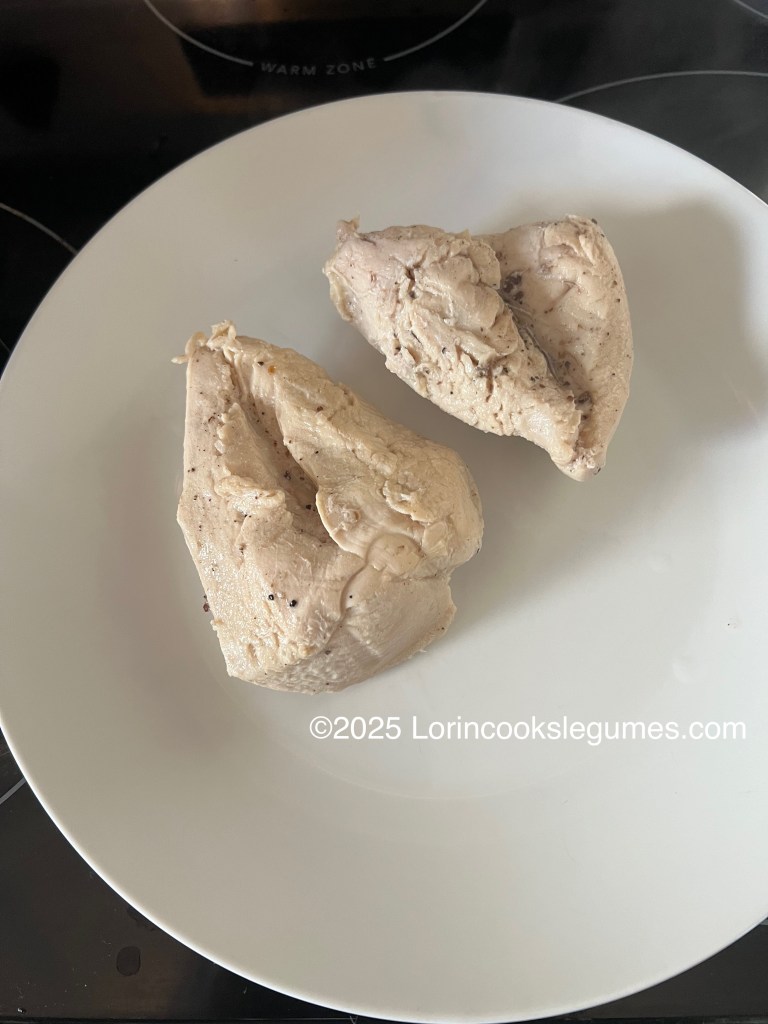 Place chicken breast in a saucepan, along with roughly chopped onion, garlic, and roughly chopped celery. Add 4 cups of water and season with salt and pepper. Bring to a boil and skim off any foam that rises to the surface. Lower the heat and cook, covered, until chicken is fully cooked, 20-30 minutes. Remove chicken from the broth and set aside to cool. Strain the broth and keep it warm. Once the chicken is cool enough to handle, use your hands or two forks to shred it fairly finely. Set aside.