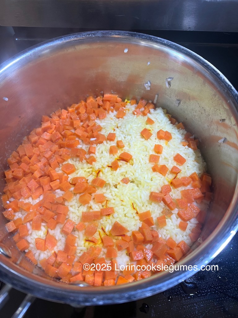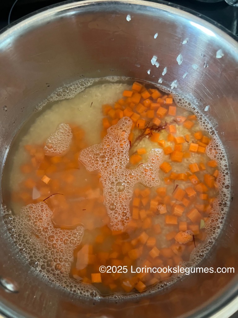 Rinse the rice in a couple of changes of water, drain, and place in a saucepan. Add the carrots, saffron, and chicken stock. Bring to a boil, turn the heat to low, and cover. Cook for 15 minutes, until broth is fully absorbed. Remove from heat and allow to rest for 5 minutes before removing the lid.