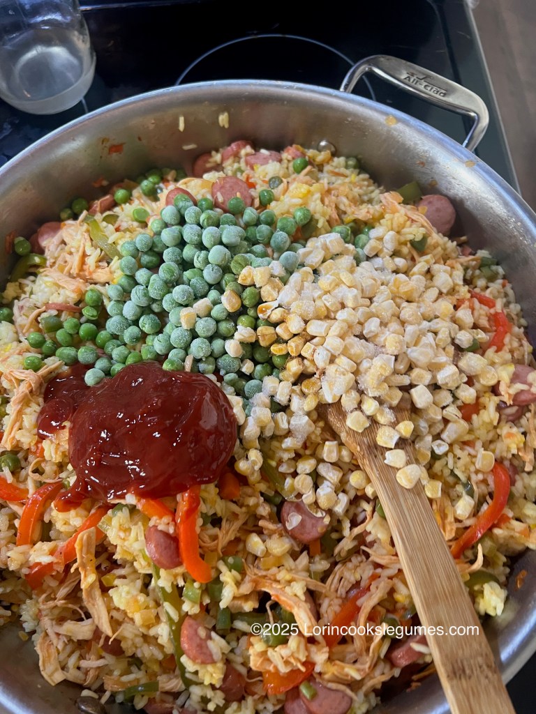 Turn the heat to low, add the cooked rice, and mix well. Stir in the peas, corn, ketchup, and Worcestershire sauce. Cook for about 5 more minutes, stirring, until flavors are melded. Taste for salt and pepper, transfer to a serving platter, and garnish with remaining red pepper juliennes.