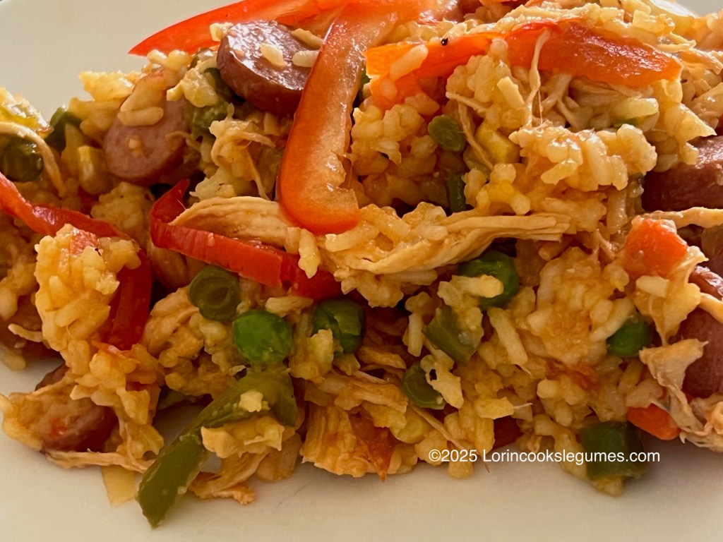 Nicaraguan arroz a la Valenciana typically has shredded chicken and hotdogs and is seasoned with ketchup, mustard, and Worcestershire. Yes, according to the one English-speaking vlogger I watched, hotdogs really are the traditional sausage to use, and the sausages in the Spanish-speaking videos I watched mostly looked like hot dogs. Given that the English-speaking vlogger didn’t have much of an accent, I considered the possibility that she’s a second-generation immigrant, and that’s just what her family could afford here in America, but given the use of other pretty typically American ingredients like ketchup, which I was able to confirm across several different recipes, it seems like American groceries are probably now more readily available in Nicaragua than whatever would have been the traditional ingredients 100 years ago. Most of the recipes were pretty clear in that it should be pork sausage, “not beef”. I don’t tend to eat hot dogs very much, so I was a little shocked at how few options there were in my local grocery store that didn’t contain beef. The only option I could find that was 100% pork and still fell into the realm of what I would consider a hot dog was Oscar Mayer Smokies*. I suppose some chicken or turkey content would have been acceptable, but I thought the flavor of the Smokies was a pretty good match for the rest of the dish.