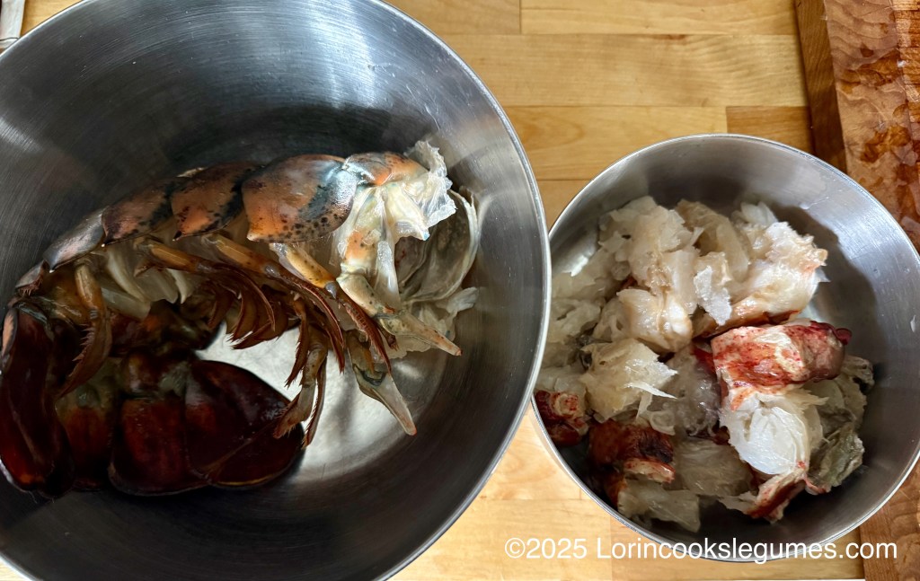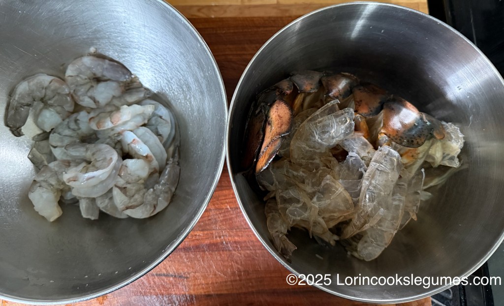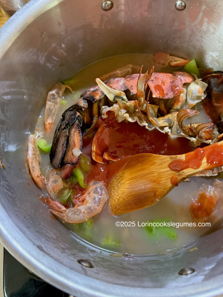 Peel and clean the shrimp, reserving the shells. Remove the lobster from its shell, reserving the head and shells, and chop the meat into bite-sized pieces. Refrigerate the shrimp and lobster meat.