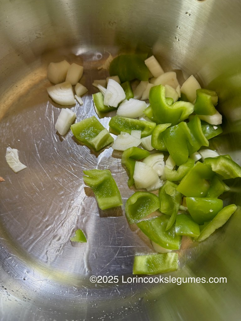 Heat ½ Tablespoon olive oil in a large pot and sauté roughly chopped onion and bell pepper for about 5 minutes, until onion is translucent.