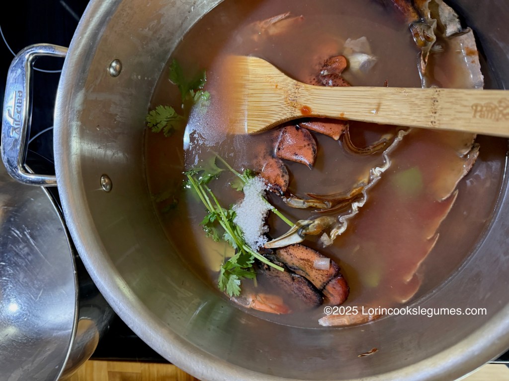 Add 4 cloves of crushed garlic and the shrimp and lobster shells. Cook, stirring, for about 2 minutes, until the shells turn redish.
