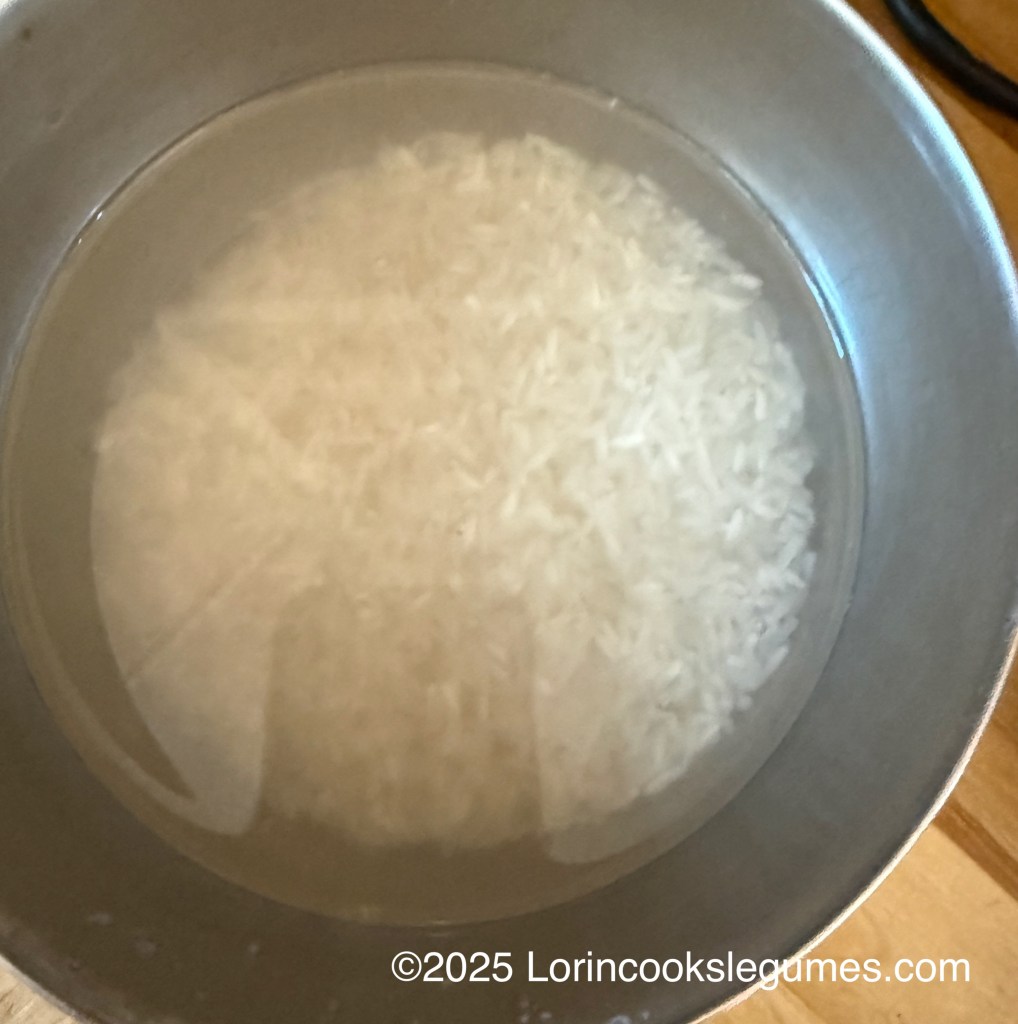 Rinse your rice in several changes of water until the water runs clear. Cover with cool water and allow to soak while you proceed with the recipe.