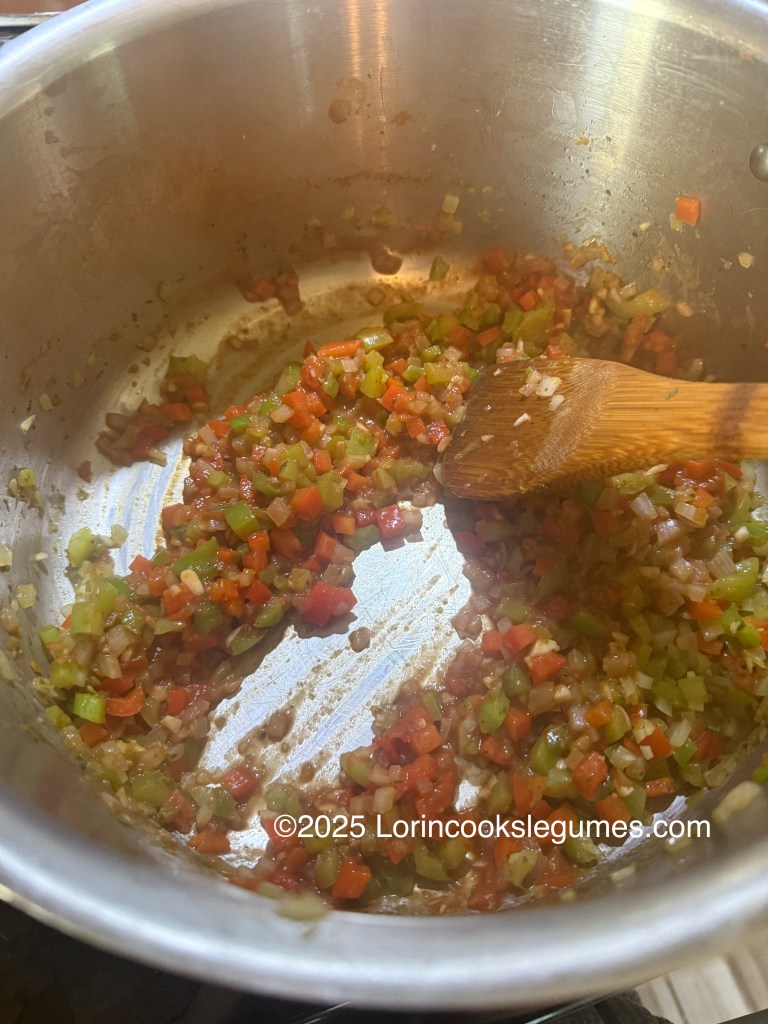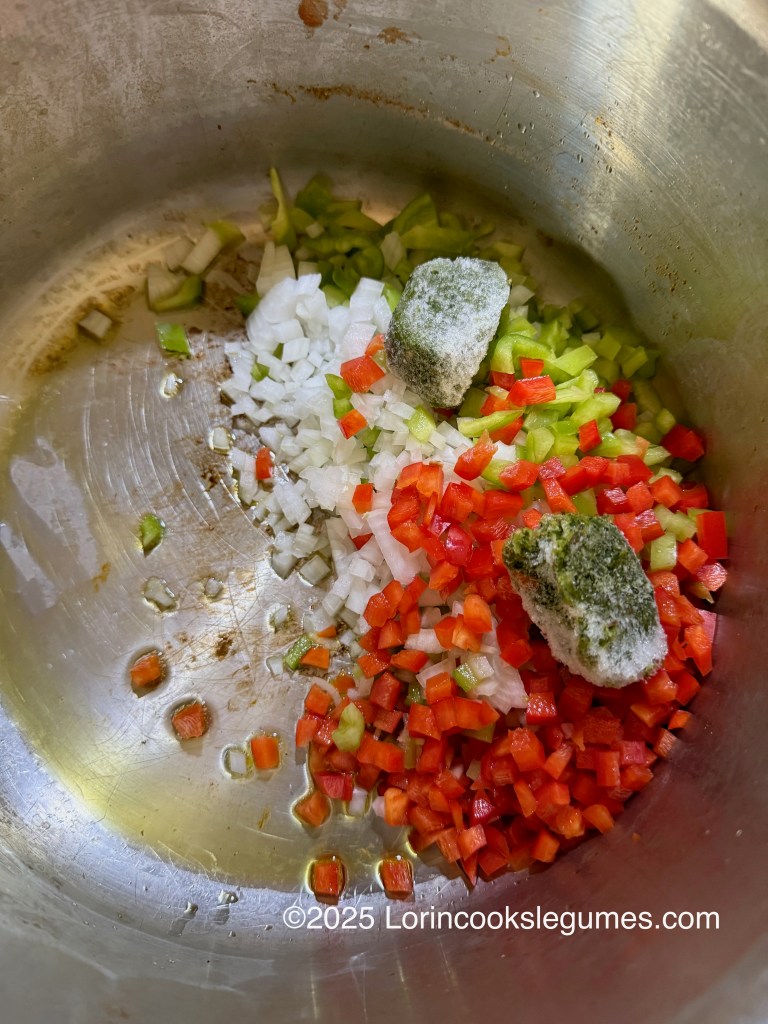 Heat 1 Tablespoon of olive oil in a large, heavy-bottomed pot over medium heat. Sauté the diced onion, peppers, and sofrito until the onion is translucent, about 5 minutes.