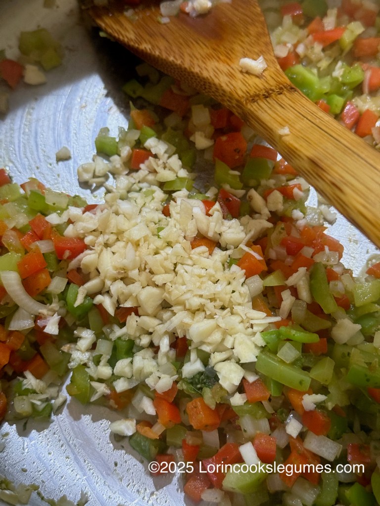 Add minced garlic and cook for another minute. Add ½ cup tomato sauce and mix well, then add ½ teaspoon salt, black pepper, sazon, oregano, 2 bay leaves, saffron, cumin, and adobo. Mix well and cook for another minute or two.