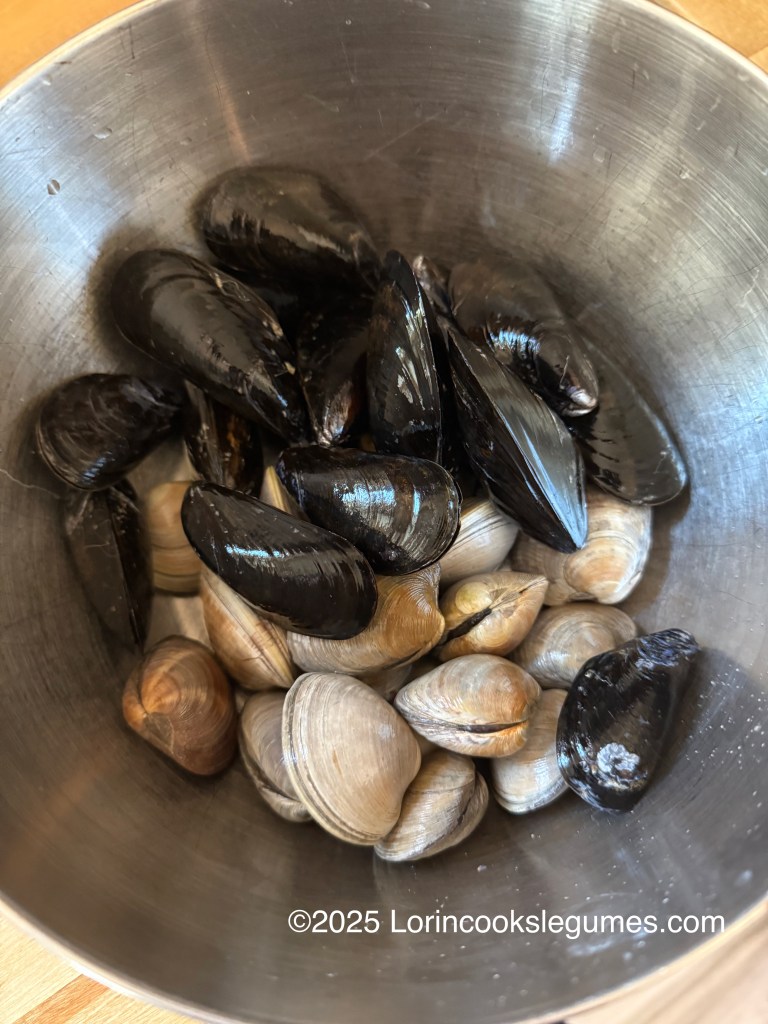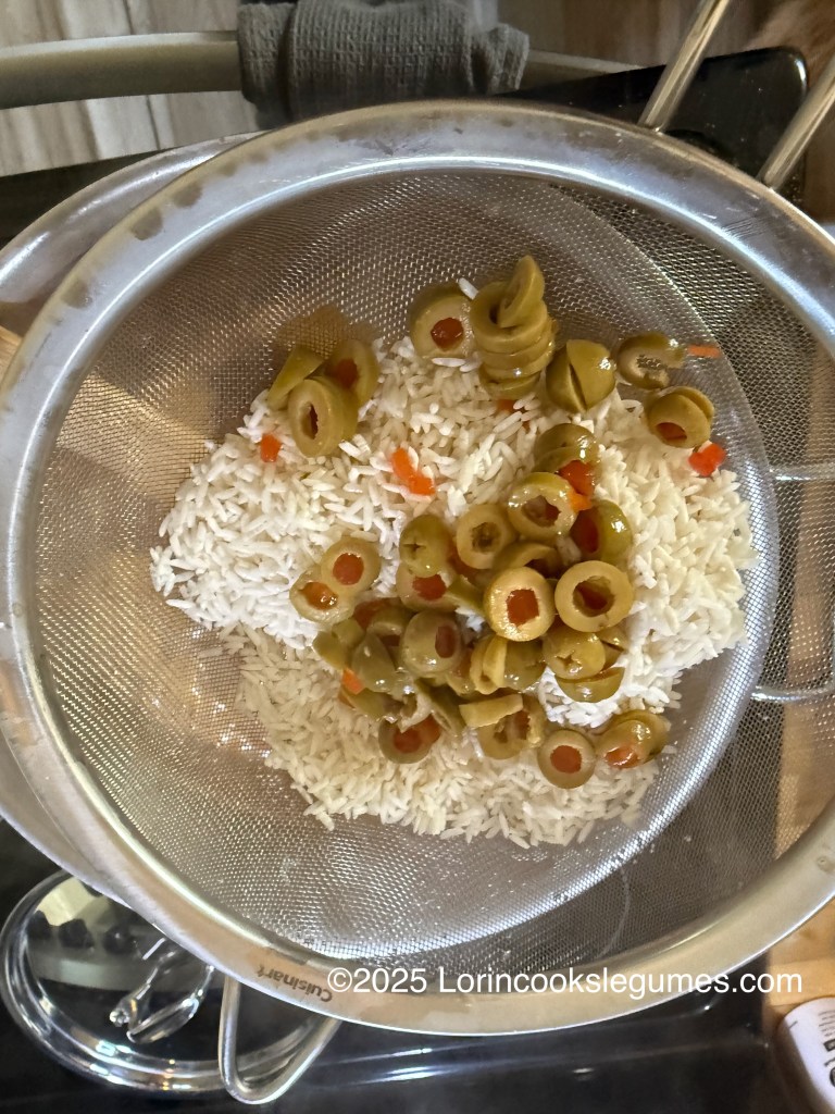 Drain the rice and add it, along with the olives, clams, and mussels. Reduce heat, and cook, covered, covered, until rice is tender, 15-20 minutes.