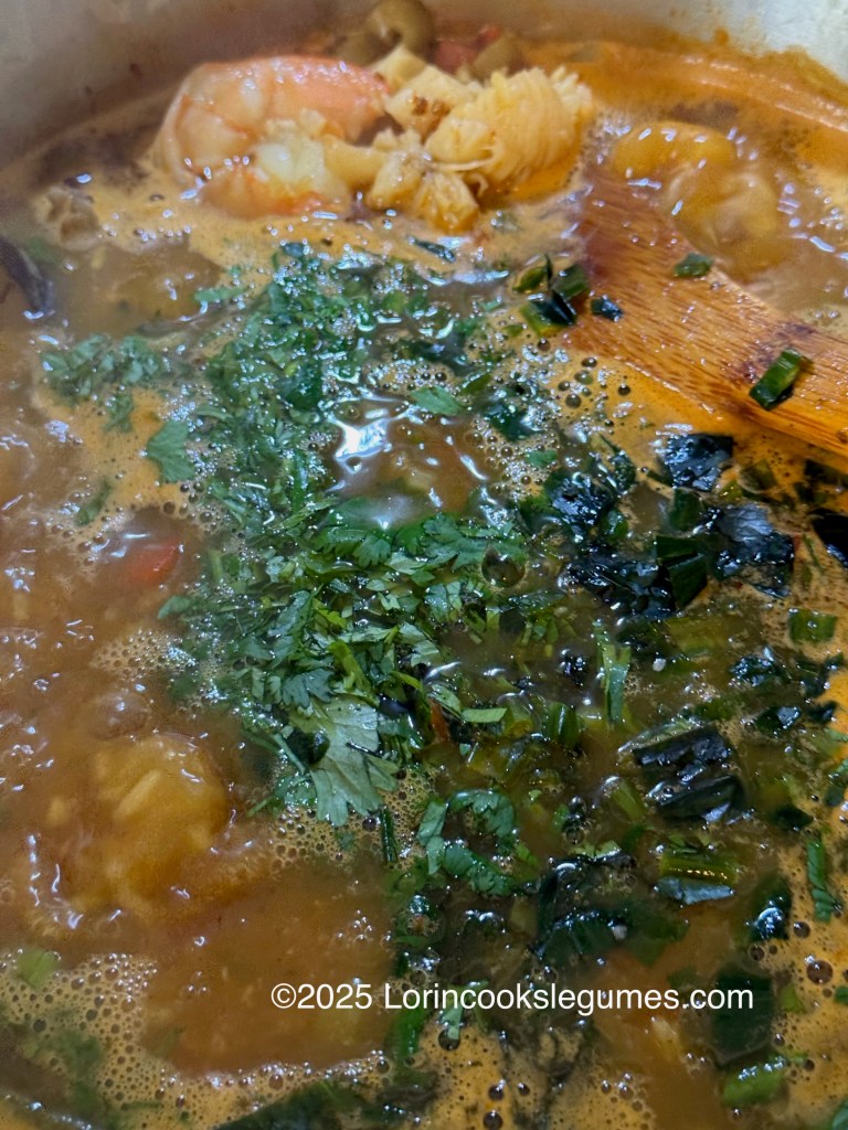 Turn off the heat and add scallops, shrimp and lobster. Allow carryover heat to cook the seafood for another 8 minutes or so.